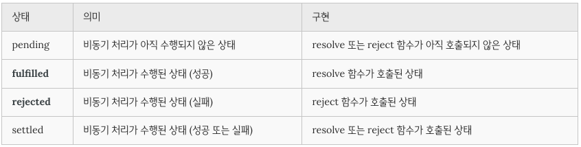 - 생성자를 통해 프로미스 객체를 만드는 순간 pending 상태가 된다. 이때 비동기 처리가 성공하면 콜백 함수의 인자로 전달받은 resolve 함수를 호출하고 이 때 프로미스는 fulfilled 상태가 된다. 비동기 처리가 실패하면 reject 함수를 호출하고 이 때 프로미스는 rejected 상태가 된다.
