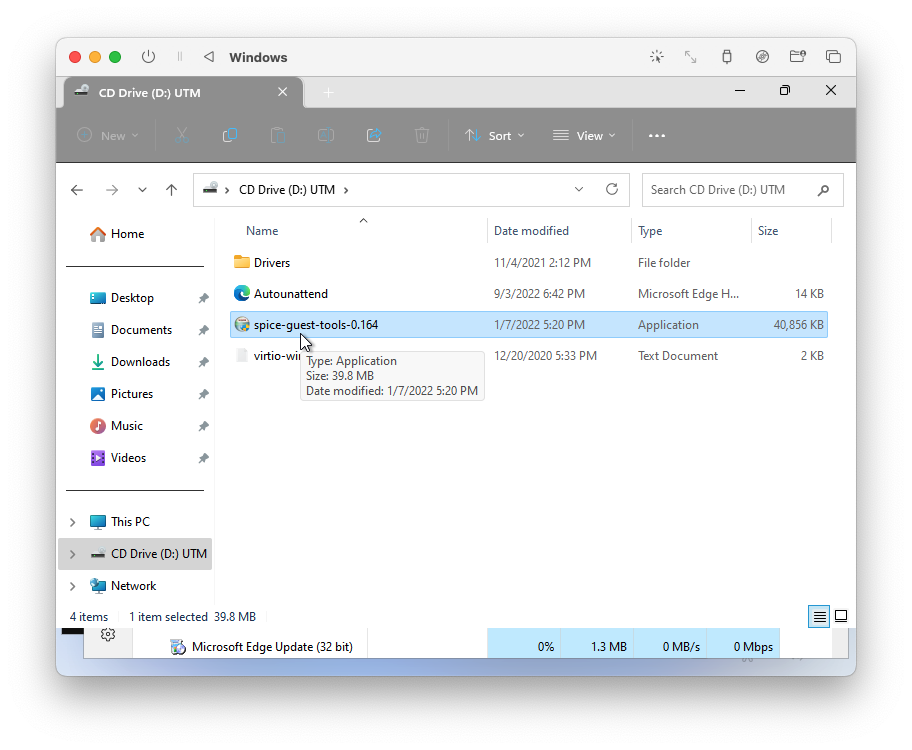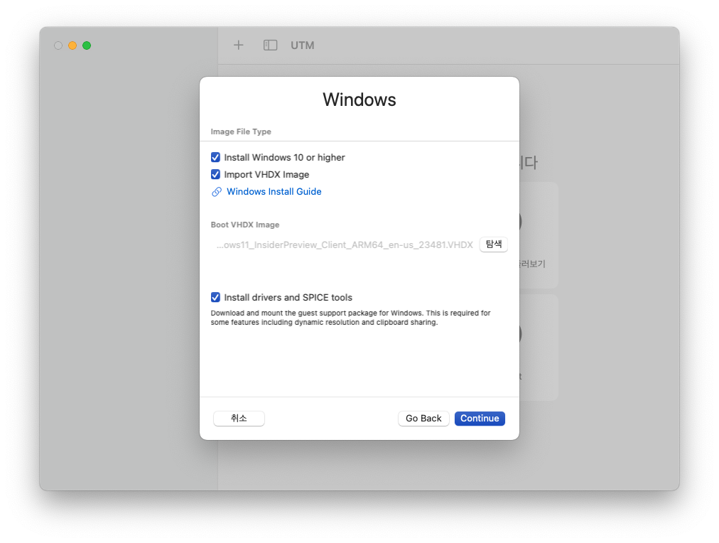 - 그리고 좌측 C 드라이브의 UTM 폴더를 선택하고 spice-guest-tools 실행 파일을 선택해주면 된다.