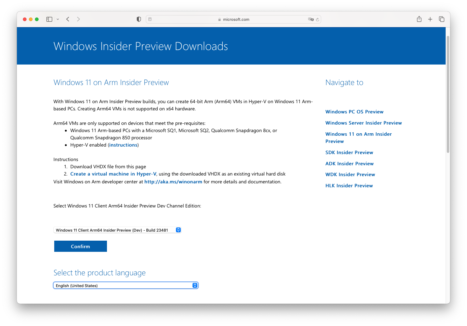 - 위 주소에서 'Windows 11 Client Arm64 Insider Preview(Dev Channel)'을 선택하고, 언어를 'English'로 선택하고 'Confirm' 버튼을 누르면 'Download Now' 버튼이 생성되는데 해당 버튼을 누르면 자동으로 파일이 다운로드 된다.
