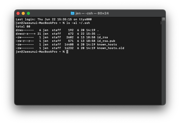 - SSH를 설정하기 전에 먼저 우리 컴퓨터에 키를 만들어 줘야 하는데, 터미널을 열고 ls -al ~/.ssh 명령어를 입력해 .ssh폴더 내 SSH 키 목록을 확인한다.