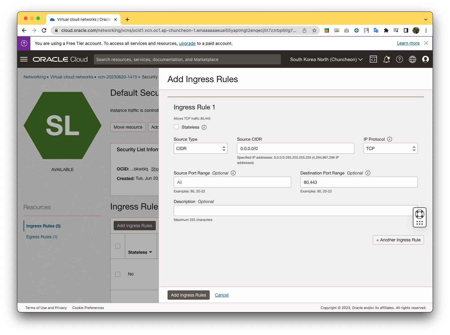 $ sudo ufw allow 'Nginx Full'- 그런데 OCI에서 ufw 명령어가 잘 안 먹는다고해서 따로 방화벽을 열어줬더니 고스트 설치시 네트워크 오류 없이 잘 설치됬다.