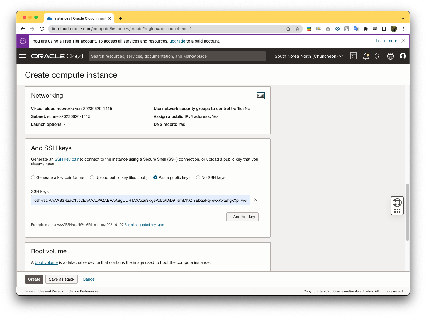 cat ~/.ssh/id_rsa.pub // id_rsa.pub 내용 확인하기- 다 입력했으면 Create 버튼을 눌러 VM을 생성한다. 이 때 Subnet 주소를 클릭하고 Security lists 내 Default security list for vcn으로 된 부분을 클릭해 준다.