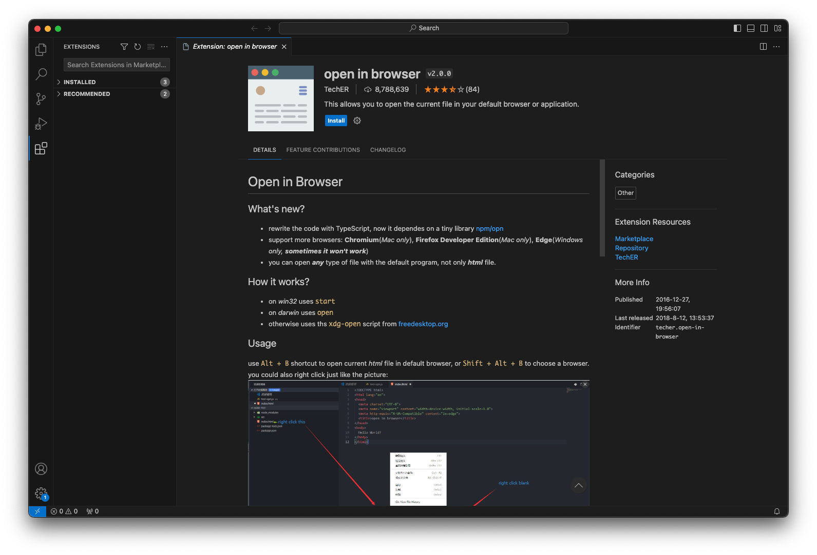 기본 설정된 브라우저로 파일을 열어볼 수 있게 하는 익스텐션인 Open in browser 앱