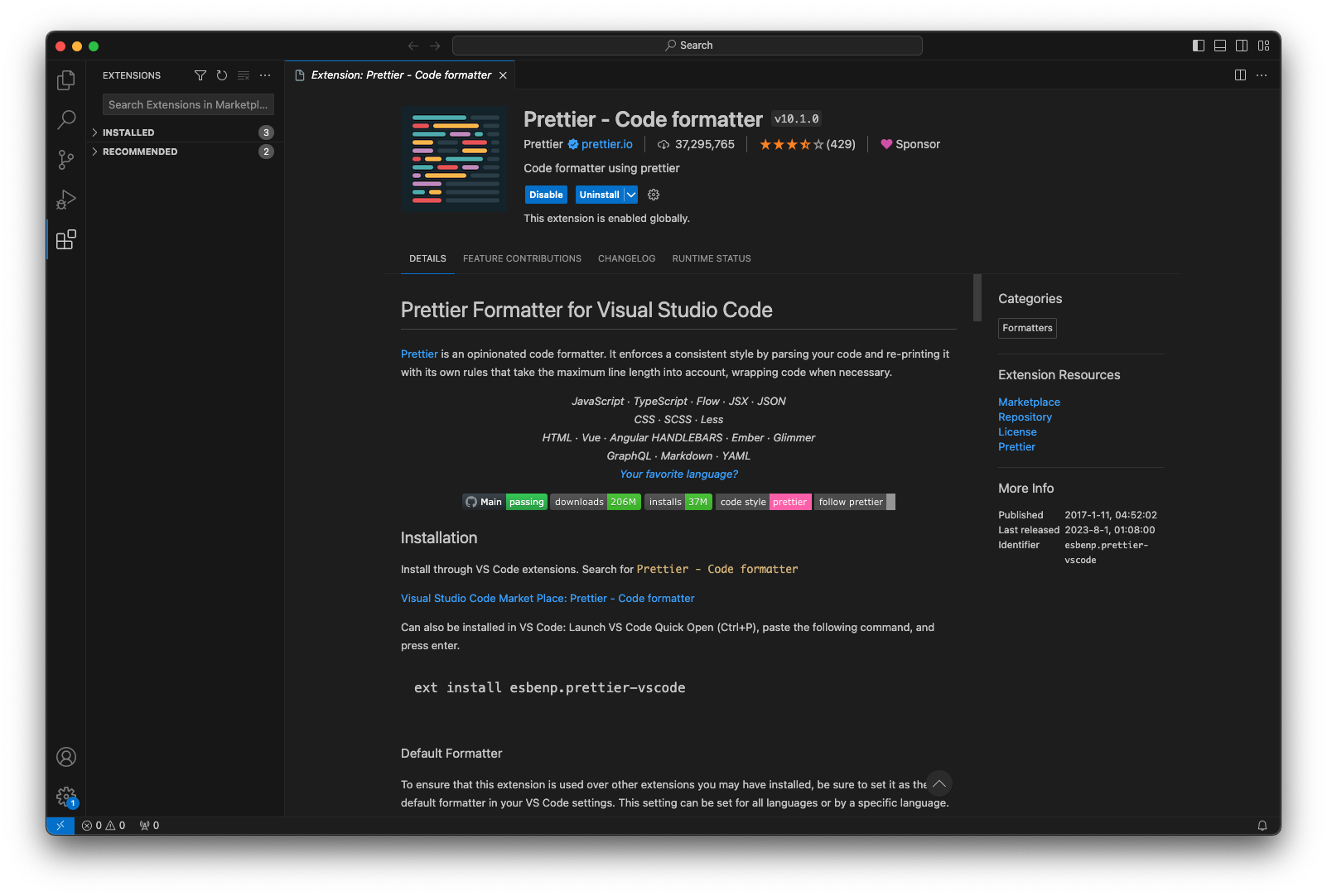 Prettier 익스텐션의 경우 코드를 이쁘게 정리해주는 코드 포매터다