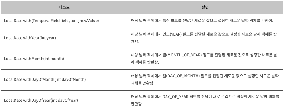 - LocalDate 클래스에서 제공하는 with() 메소드는 아래와 같다.