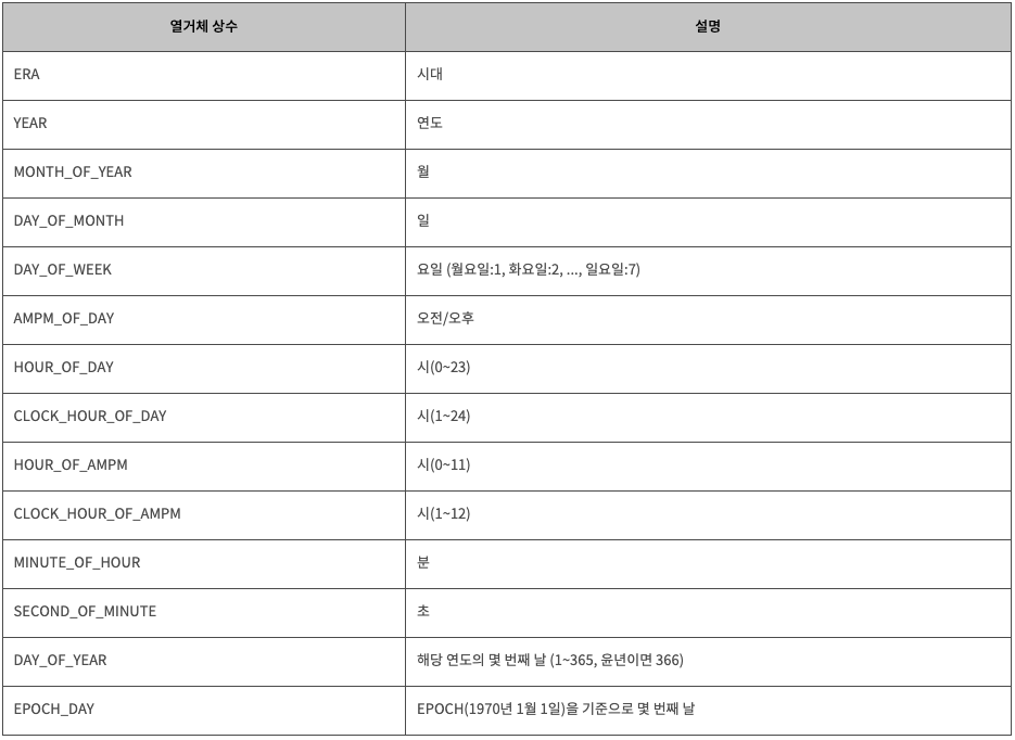 - ChronoField 열거체에 정의된 대표적인 열거체 상수는 아래와 같다.