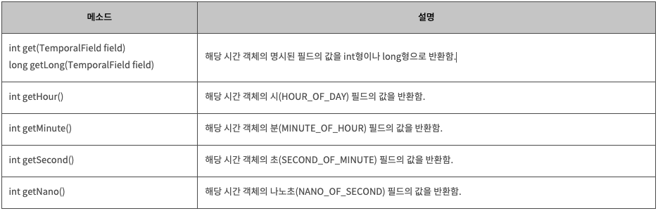 - LocalDate와 LocalTime 클래스는 특정 필드의 값을 가져오기 위해서 다음과 같이 다양한 getter 메소드를 제공한다.