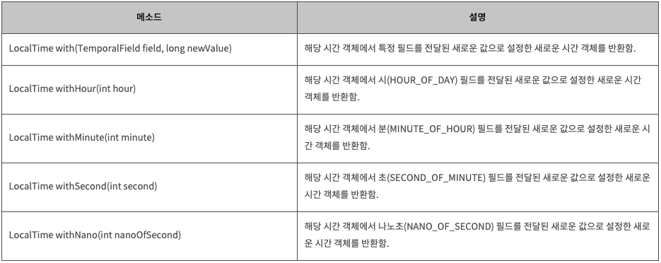 - LocalTime 클래스에서 제공하는 with() 메소드는 아래와 같다.