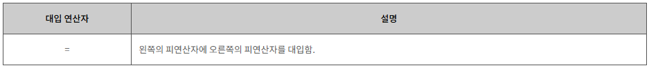 - 대입 연산자는 변수에 값을 대입할 때 사용하는 이항 연산자이며, 피연산자들의 결합 방향은 오른쪽에서 왼쪽이다.