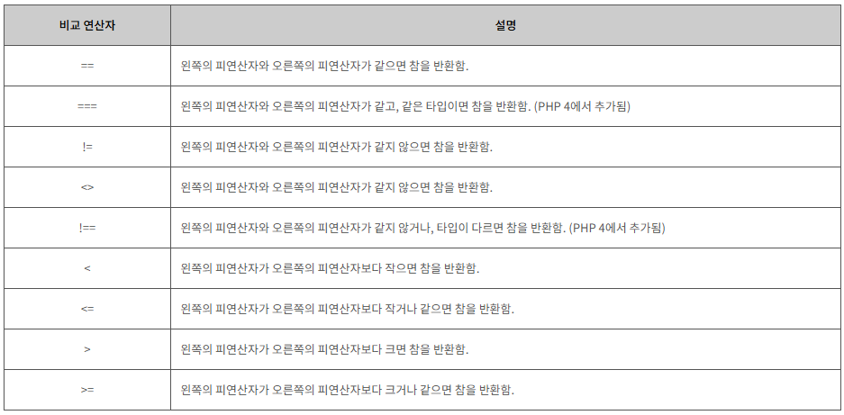 | array | array | 배열끼리의 비교는 같은 키를 가지는 값을 서로 비교함. 이때 피연산자1 배열의 키가 피연산자2 배열에 존재하지 않으면 비교할 수 없으며, 배열 요소의 수가 적은 쪽이 작은 거로 판단됨. |
