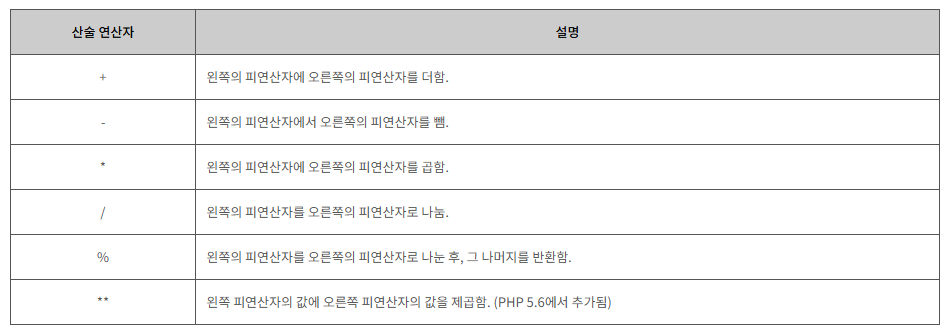 - PHP에서는 대입 연산자와 산술 연산자 등을 결합한 다양한 복합 대입 연산자를 제공한다.