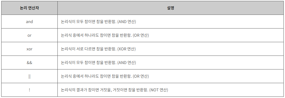 - 논리 연산자는 논리식을 판단하여, 참(true)과 거짓(false)을 반환한다.