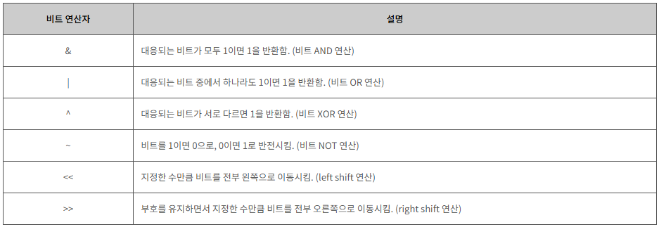 - 비트 연산자는 논리 연산자와 비슷하지만, 비트(bit) 단위로 논리 연산을 수행한다. 또한, 비트 단위로 전체 비트를 왼쪽이나 오른쪽으로 이동시킬 때도 사용한다.
